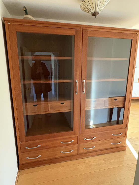 This high-quality display cabinet combines timeless design with practical storage space. Crafted from solid cherry wood, the cabinet exudes warmth and class. The two large doors feature clear glass, which is ideal for stylishly displaying dishes, books or decorative objects.