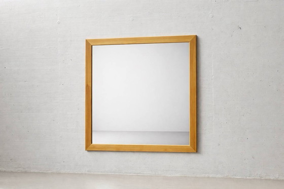 Timeless wall mirror in the clean, minimalist style of the 1960s. The wide frame, crafted from light-grained maple, impresses with its gently rounded edges and precisely executed miters, highlighting the high-quality workmanship. The generously sized, square mirror surface is elegantly framed by the warm wood tone, bringing a sense of calm and brightness to the room. Its simple design makes the mirror versatile – whether in the entryway, bedroom, or as a subtle statement piece in a mid-century modern interior. Sturdy metal hanging hardware is attached to the back.