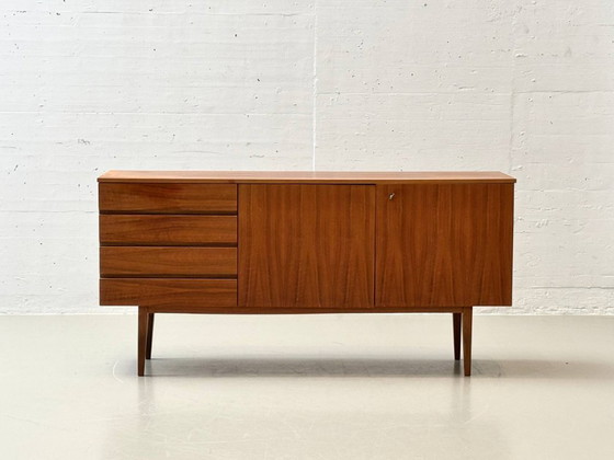 A generously proportioned sideboard from the 1960s, crafted from high-quality teak. The clean, horizontally structured design is defined by the striking contrast between the drawer unit and the solid body. The left-hand section, with its four staggered drawers, is particularly eye-catching, its slightly recessed fronts lending the piece depth and a sculptural quality.