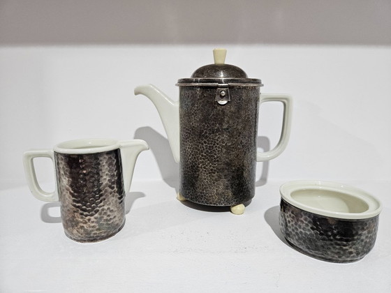 A unique, three-point coffee or tea set, a beautiful example of Art Déco design from the 1930s. The set includes a jug, a milk jug and a sugar bowl, characterized by an intriguing combination of white porcelain and oxidized, hammered metal. Metal casings give the elements a modern, industrial character, while ensuring thermal insulation. Perfect to enrich any interior. The items have the natural patina of time, the sugar bowl lid is missing.