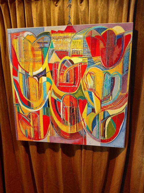 Ellen van Randeraat trained at the School of Applied Arts and the Art Academy in Rotterdam. She also studied at the ‘Akademie für musisch-kulturelle Bildung’ in Germany and attended the summer academy in Drachten. Her acrylic paintings represent an expressionistic and positive approach to nature, people, music, and poetry. Characteristic of Ellen’s work is a powerful yet intimate use of color and a clear structure. This offered work is a delightful example of that! Original works are rarely for sale, so prints are offered instead. In this case, you can acquire a genuine painting and admire the extremely skillfully executed canvas of this artwork. An absolute must.