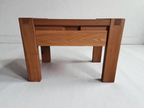 This small bedside table is of very high quality, crafted from elm, a wood prized for its strength and warm grain. The lines are clean and well-proportioned, typical of Monopoly's designs: furniture built to last, a far cry from standardized industrial production. Monopoly is a French furniture manufacturer and publisher, active primarily in the second half of the 20th century. The brand is known for its small-batch production, using fine woods (elm, oak, cherry), with particular attention paid to joinery and durability. Their furniture sits at the intersection of craftsmanship and functional design, with a genuine commitment to quality.