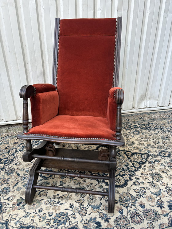 This elegant mid-century English rocking chair features a rich red velvet upholstery paired with beautifully crafted wooden elements. Its classic design and comfortable seating make it a perfect addition to any living space. The chair's sturdy construction ensures durability, while the velvet adds a touch of luxury.