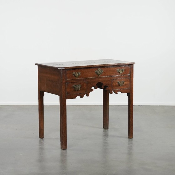 This beautiful antique English lowboy is made of oak and dates back to the 18th century. Due to its age, the item has a beautiful patina and beautiful colors. The lowboy features ornate carvings and elegant gold-colored handles. It can easily be placed in both classic and modern interiors in your chosen space. Years of responsible use have given it normal signs of wear, which contributes to its character. Structurally, it is in good condition and ready for immediate use. Will it soon be part of your interior?