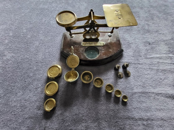 English letter scale with stack weights and a set of cup weights
