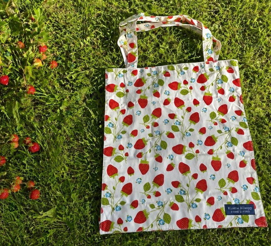 English "Strawberry" tote bag. Designed by Kirstie Allsopp (British TV presenter), creator of an accessories and home decor collection. Laminated canvas. Decidedly British with this pretty print! Brand new with tags. Dimensions (excluding handles): 37.5 x 33 cm. Depth: 8 cm.