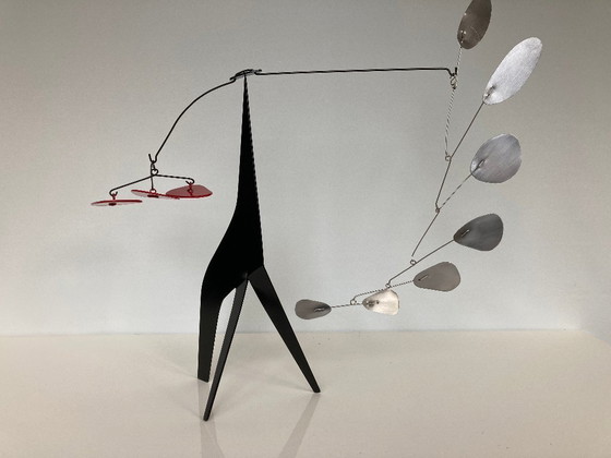 Bring a touch of modern art into your home with this beautiful Equilibration 01 Stabile. This unique piece is a true eye-catcher with its elegant balance and fluid movements. The combination of black, red, and silver creates a striking contrast that brings any room to life.