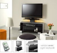 Furniture system with low column and screen holder, two peripheral support trays and rear cable storage box. Exclusive to ERARD: external connectors and Light Motion® ambient lighting system (ref. 2567).
