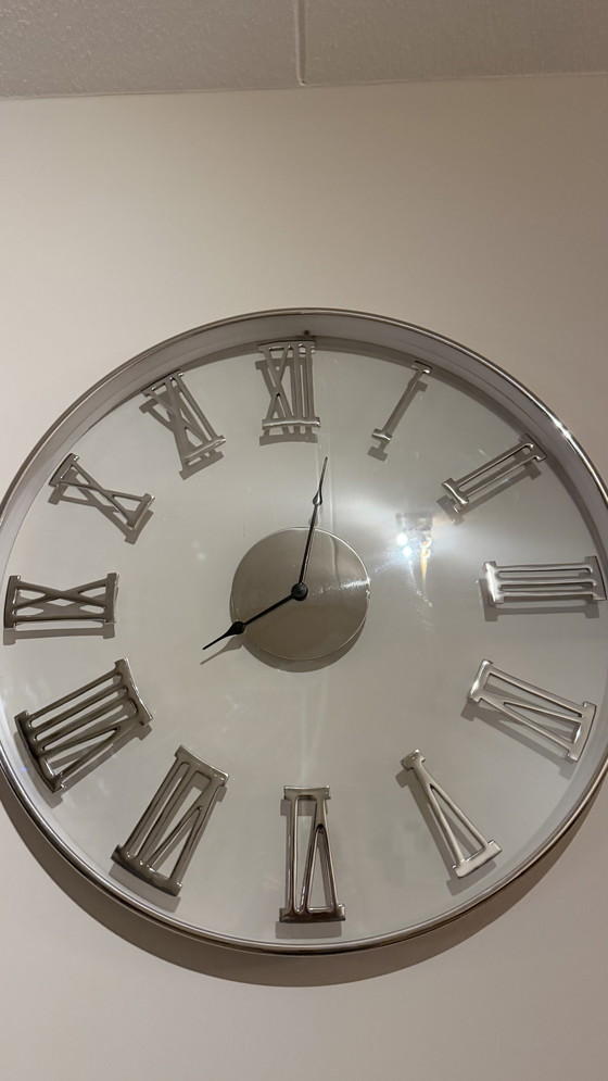Beautiful large wall clock with metal Roman numerals and a silver/chrome-colored rim.