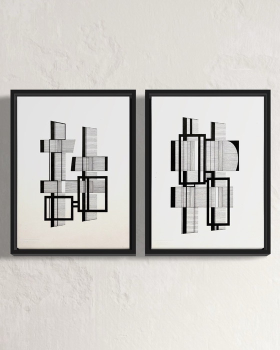 Two cohesive works by Eechaut, composed in stark black ink on paper, exploring the tension between precision and abstraction. Each piece consists of a dense interlocking matrix of geometric forms—rigid rectangles, narrow verticals, intersecting lines, and subtly varied opacities—arranged in a near-symmetrical rhythm. While entirely non-representational, the compositions evoke urban or architectural frameworks. Their mechanical regularity is offset by slight imperfections in line and fill, lending them a quiet, tactile humanity. These works speak to Eechaut’s recurring interest in structure, repetition, and the visual language of systems.