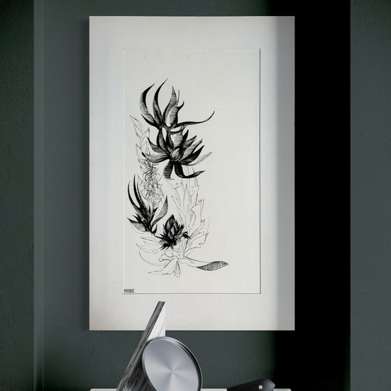 This ink on paper work by Eugène Eechaut, dated 1970, presents a vertical, semi-abstract composition built from organic, plant-like forms that shift between botanical imagery and surreal suggestion.