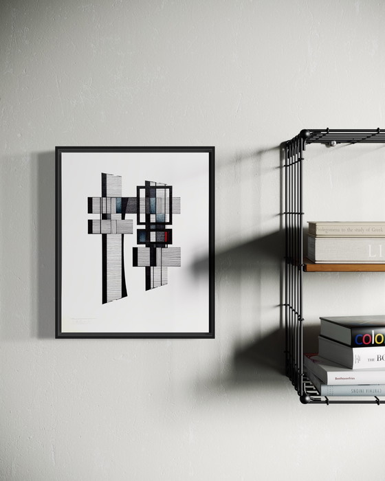 This geometric ink drawing by Eechaut presents an interplay of symmetry, transparency, and layered precision. Two vertical constructs dominate the composition, composed of interlocking rectangles, filled with linear patterns and gradients of black, gray, and muted blue, punctuated by a single sharp red accent. The work hints at architectural structure or digital circuitry, yet maintains an abstract autonomy. Minimalist in palette but rich in detail, it reflects Eechaut's signature restraint and control, merging Bauhaus clarity with a poetic sense of order.