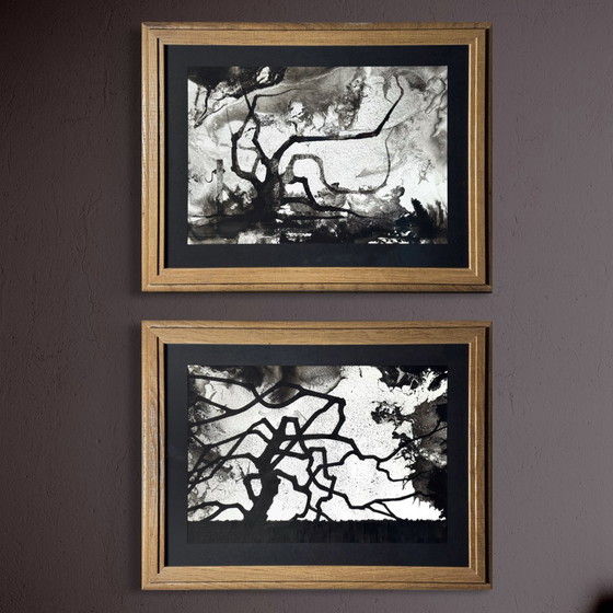 This striking pair of ink on paper works by Eugène Eechaut showcases the artist’s distinctive and recognizable style. Bold black branches emerge from layered washes of ink, creating dramatic contrasts and an atmospheric landscape where natural forms begin to dissolve into expressive abstract structures.