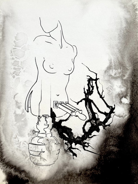 A surreal composition blending organic and mechanical forms, featuring a fragmented female torso with mechanical appendages and a barren branch. The dreamlike composition and interplay between body and object reflect the influence of Belgian surrealists such as Paul Delvaux and René Magritte, emphasizing ambiguity, transformation, and subconscious narrative.