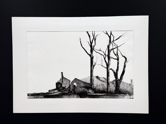 Executed in the artist’s recognizable technique of precise yet expressive linework, this piece reflects the influence of Belgian Surrealism in its enigmatic, dreamlike stillness. The surreal mood emerges not from distortion but from absence and restraint: an uncanny silence, a landscape that feels staged, watching.