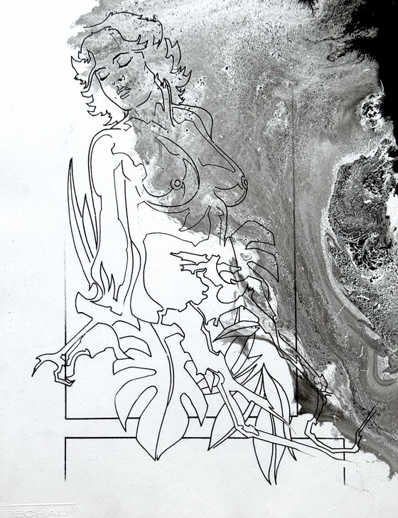 In this evocative mixed-media work, a reclining female nude is rendered with fluid, continuous lines, merging sensually with lush monstera leaves and tropical foliage. A swirling black and grey marbled backdrop engulfs the figure’s right side, blurring the boundary between body and environment. The tension between precise linework and the unpredictable fluidity of the marbling technique gives the composition a dreamlike, surreal quality. The figure’s expression is serene, almost asleep, reinforcing a sense of inner reverie or escape. Echoes of Belgian surrealism resonate in the blending of organic form and abstraction, grounding this piece within a poetic and psychologically charged space.