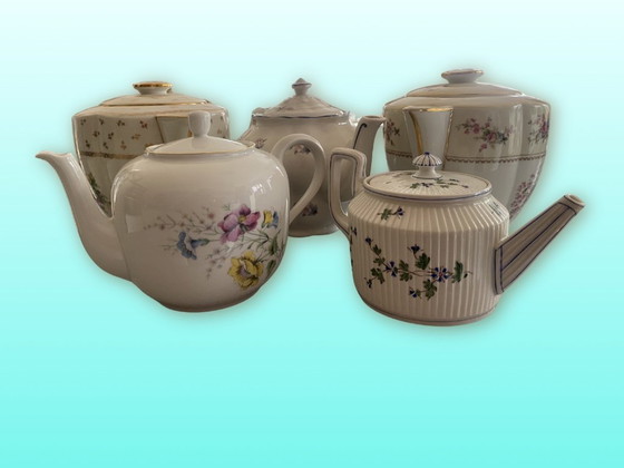 An eclectic and charming collection of five vintage European porcelain teapots, specifically selected for their floral themes. This set combines prestigious English, French, and Italian manufacturers, perfect for a collector or a sophisticated tea display.
