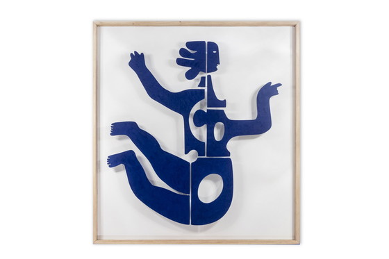 Eva" bas-relief panel, in cut metal and blue lacquer.