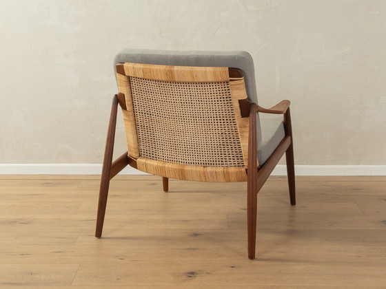 Exclusive armchair, Type 400, from the 1950s by Hartmut Lohmeyer for Wilkhahn. High-quality teak frame with new, contemporary wicker work. The armchair has been reupholstered and covered with a high-quality grey upholstery fabric. Quality features: accomplished design with perfect proportions, high quality workmanship, made in Germany. Design by Hartmut Lohmeyer, manufacturer Wilkhahn.