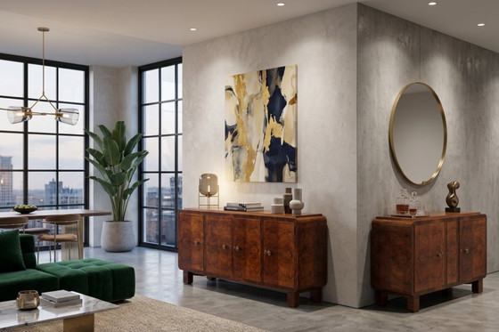 We offer for sale a splendid pair of original sideboards from the 1930s, authentic masterpieces of Art Deco cabinetry. Crafted from fine burl wood, these pieces are distinguished by their exceptional wood grain, sinuous, rounded lines, and solid structure, a testament to the craftsmanship of yesteryear.