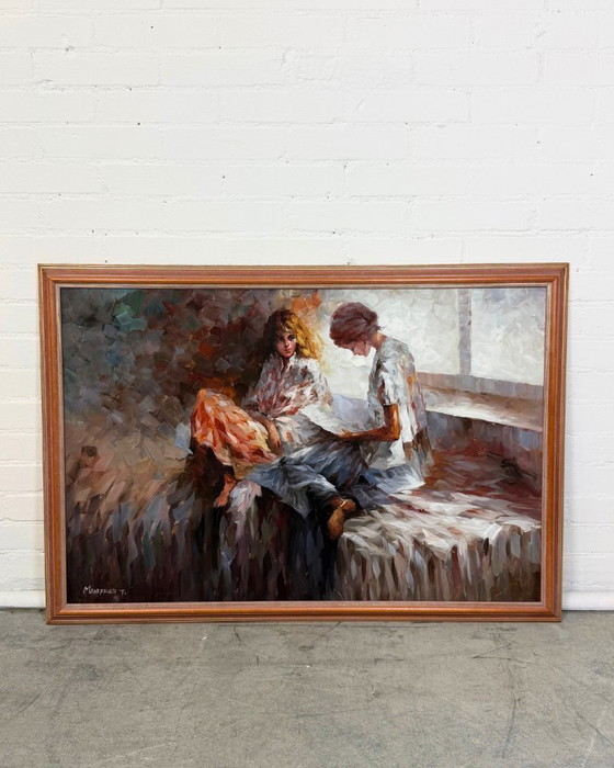 Striking late 20th-century figurative painting depicting an intimate interior scene with two seated figures. Executed with confident palette-knife technique and rich texture, the work combines emotional depth with a refined, muted color palette.