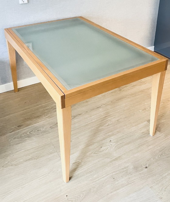 Solid beech wood with frosted glass insert.