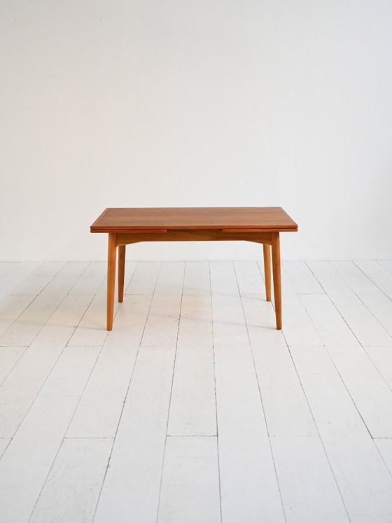 Danish dining table from the 1960s, featuring clean lines and balanced proportions. The legs are made of solid oak, while the top is veneered in teak, with a shaped edge and rounded profile. The table includes two pull-out extension leaves stored beneath the top, allowing the length to be extended while maintaining visual continuity. Each extension leaf measures 50cm.