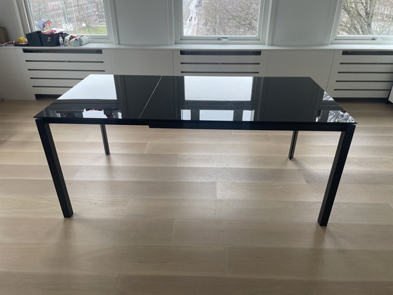 I bought this extendable dining table a while ago at a Habitat store in Paris. The table has a black glass top and black metal legs in a triangular shape, which gives it a less bulky appearance. The glass top has some signs of wear from daily use over the years. See the photos for details.