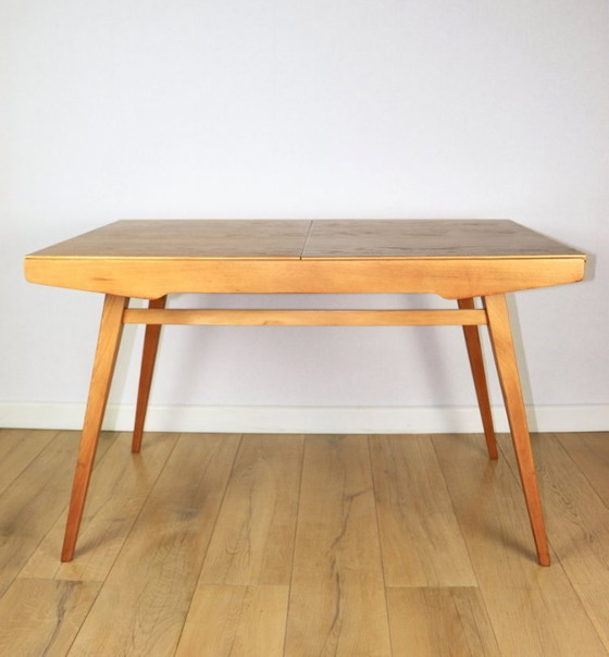 Extendable wooden dining table with an ash veneer top. Manufactured in the 1960s in Czechoslovakia, it is in beautiful condition. Restored in the natural, light wood color.
