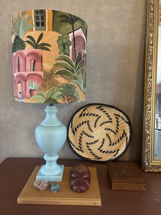 This unique table lamp with a turquoise base and striking shade is a real eye-catcher. The shade, with its warm colors and tropical details, makes it perfect for a boho, eclectic, or vintage interior.