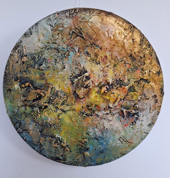 Unique round canvas, 40 cm in diameter, created by artist Ali Kleinhuis. The round shape gives the work a playful yet powerful appearance—no angles, no beginning or end, but a flowing movement that continues to captivate.