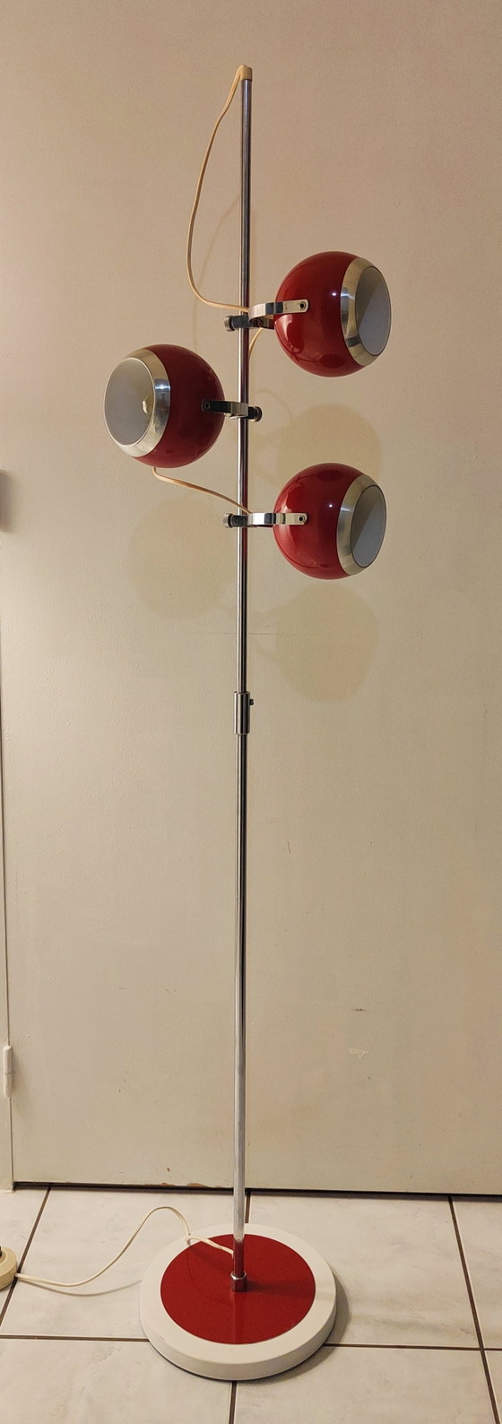 Emblematic floor lamp from the 70's The eyes ball 3 globes that can be rotated in any direction Adjustable height Red and white color Very good condition But not new Height 1m50 Width 25cm