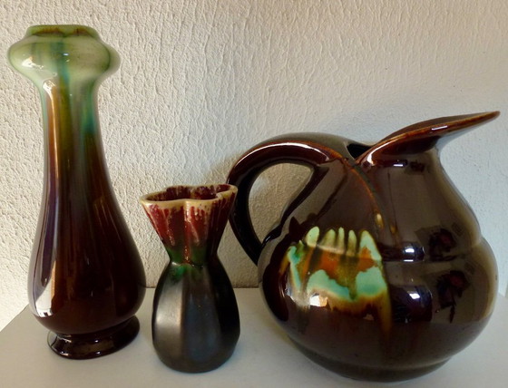 3x Faience de Thulin vases from the Art Deco period.