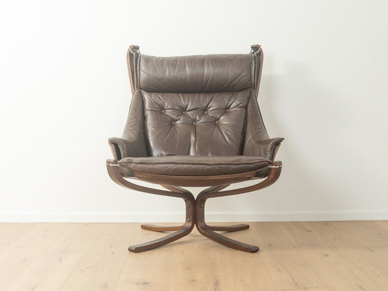 FALCON chair with footstool from the 1970s by Sigurd Ressell for Vatne Møbler. High-quality frame made of bent plywood with original dark brown leather upholstery.