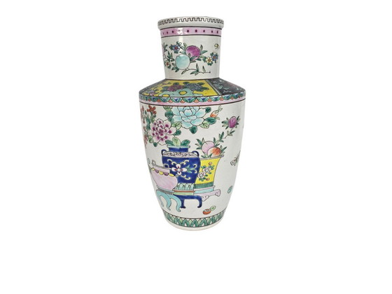 - The vase is richly decorated with colorful floral motifs, reflecting traditional Chinese aesthetics.
