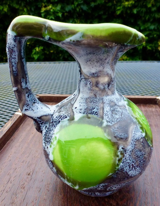 Discover this unique "Fat Lava" Vallauris vase with a striking drip glaze. This vintage vase is a real eye-catcher with its vibrant green and black hues.