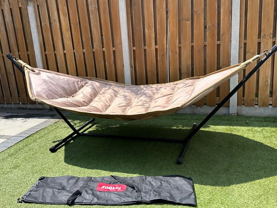 The luxury Fatboy Headdemock taupe hammock with black frame is 3.30 m long, 1.38 m wide, and 1.10 m high. The frame is made of metal with rubber rings. The hammock is made of water-repellent and UV-resistant polyester. The maximum load capacity of the hammock is 150 kilograms. The weight of the hammock is 28 kilograms and it can be easily transported in the 2 included carrying bags.