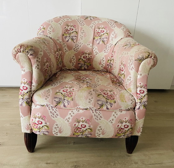 This charming vintage armchair, adorned in a delightful floral fabric, offers a touch of elegance and comfort to any living space. The soft pink tones, accented with white, green, and red floral patterns, create a warm and inviting atmosphere.