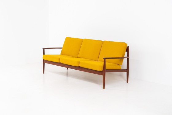 “FD-128” 3-seater by Grete Jalk for France & Son (Denmark, 1960s). This elegant masterpiece is a fine example of Scandinavian modernism. It features a solid teak frame with a warm natural grain, stunning curves and comfortable cushions, upholstered in a yellow fabric. The sofa presents itself in very good condition with only minor wear on the fabric. Labeled by maker.