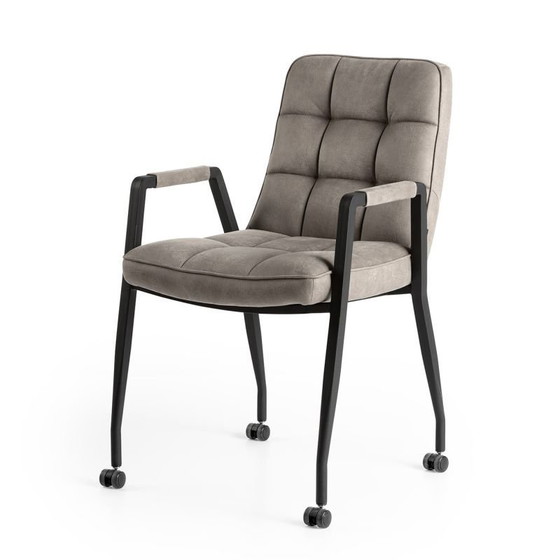 Specifications: * No long delivery times, but take it with you immediately * Delivery also possible for an additional fee * 3-month warranty * Please note: This is a show model. For more information about the price and other details, please contact our store. The Ryan armchair effortlessly combines style and functionality, making it the perfect choice for any interior. Upholstered in high-quality Chicago fabric in an elegant toffee color, this chair exudes a refined and retro look. It is the ideal addition for those who want to combine comfort with a visually appealing design. What really makes the Ryan armchair special is the checkered backrest, which offers a contemporary and luxurious look. The comfortable armrests ensure optimal enjoyment, whether you are dining, working, or seeking a moment of relaxation. For extra ease of use, the chair is equipped with wheels, so you can easily move it without effort. Thanks to its versatility, the Ryan armchair fits perfectly in a variety of spaces. Use it in the dining room, as a stylish addition to your home office, or add a touch of elegance to your living room. This chair combines functionality with a timeless look. Specifications * Upholstery: Chicago fabric in anthracite * Special features: Checkered backrest and wheels * Application: Dining room, home office or living room