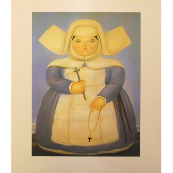 Mother Superior by Fernando Botero is a striking figurative composition rendered in the artist’s unmistakable style of exaggerated volume and soft, rounded forms. Depicting a nun holding a cross and rosary, the artwork combines religious symbolism with Botero’s signature aesthetic, creating a balance between solemnity and subtle irony.