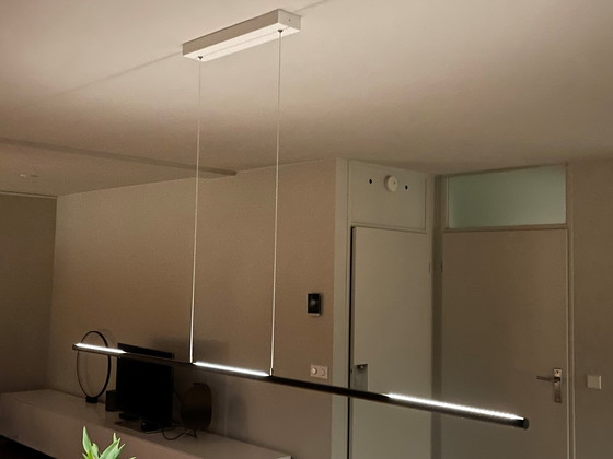 Beautiful modern Ferrolight IYO Yin Yang lamp in excellent condition. The length is 200cm and the color is black. Year of purchase is 2020. The IYO shines its light up and down, offering double lighting pleasure. Practical lighting at the bottom and mood lighting at the top. Energy label: A++ Dimmable: standard dimmable with remote control