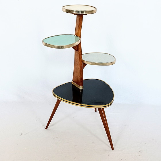 A beautiful plant table from the 1950s. Ornate and colorful. There is a spot on the top plate and it has some glue spots on the bottom, but the overall condition is very good. See photos.
