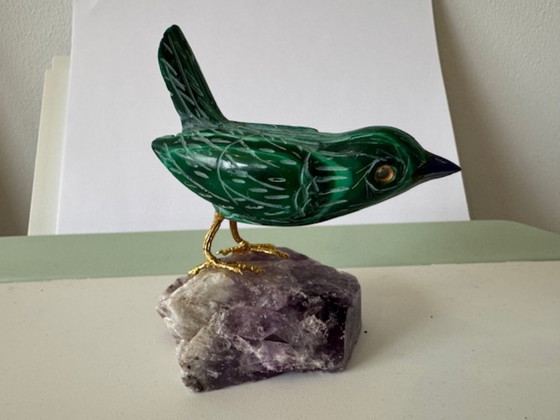 A beautiful bird carved from malachite, standing on a piece of amethyst. It has copper legs, a blue (lapis lazuli) beak, and yellowish eyes. Perfectly intact.