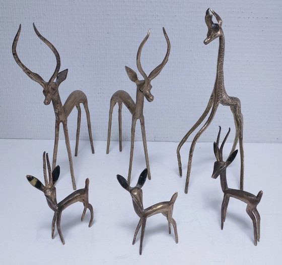 set of five animal sculptures representing gazelles, antelopes and a giraffe.
