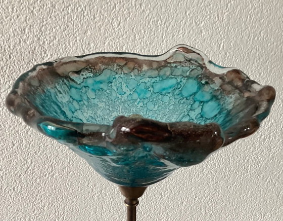 This beautiful floor lamp, handcrafted in Greece and purchased from Kallisti Gallery in Pythagorion on Samos, adds a touch of sophistication to any interior. The lampshade, made of glass, displays an enchanting interplay of blue and brown tones, which together create a unique and artistic appearance.