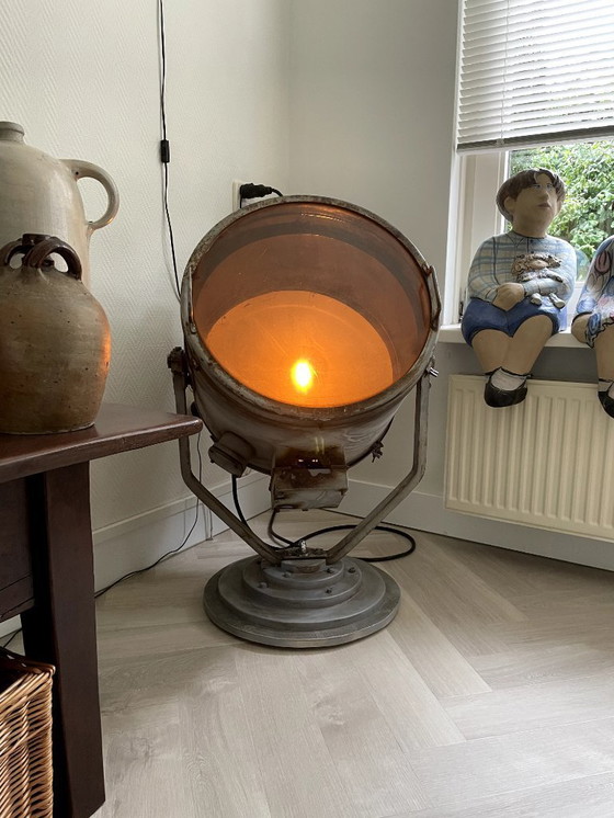 This floor lamp is originally a searchlight from a German naval ship. The wiring was replaced and an LED bulb was added that is dimmable with an app.