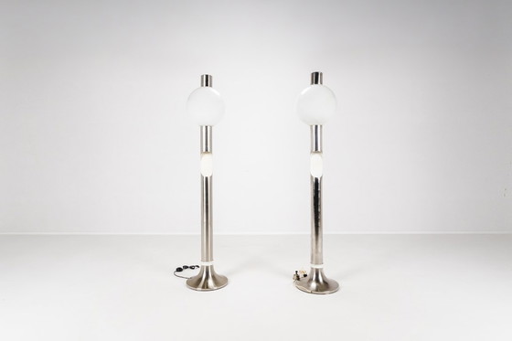 These floor lamps designed by Angelo Brotto for Esperia is a masterful composition of light, material, and balance.