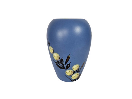 In the 1950s and 1960s, Flora was a leading manufacturer of decorative and functional ceramics. The decoration of this vase is executed in a warm light blue color with a subtle gold rim. The flowers likely represent willow catkins; they stand for strength, softness, and hope for the speedy return of spring and summer.