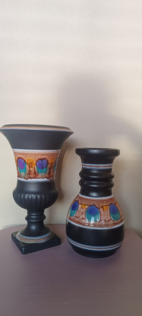 These vases are typical of the West Germany/Mid-Century style and together form a strong decorative duo. Beautiful on a sideboard, shelf, or table.